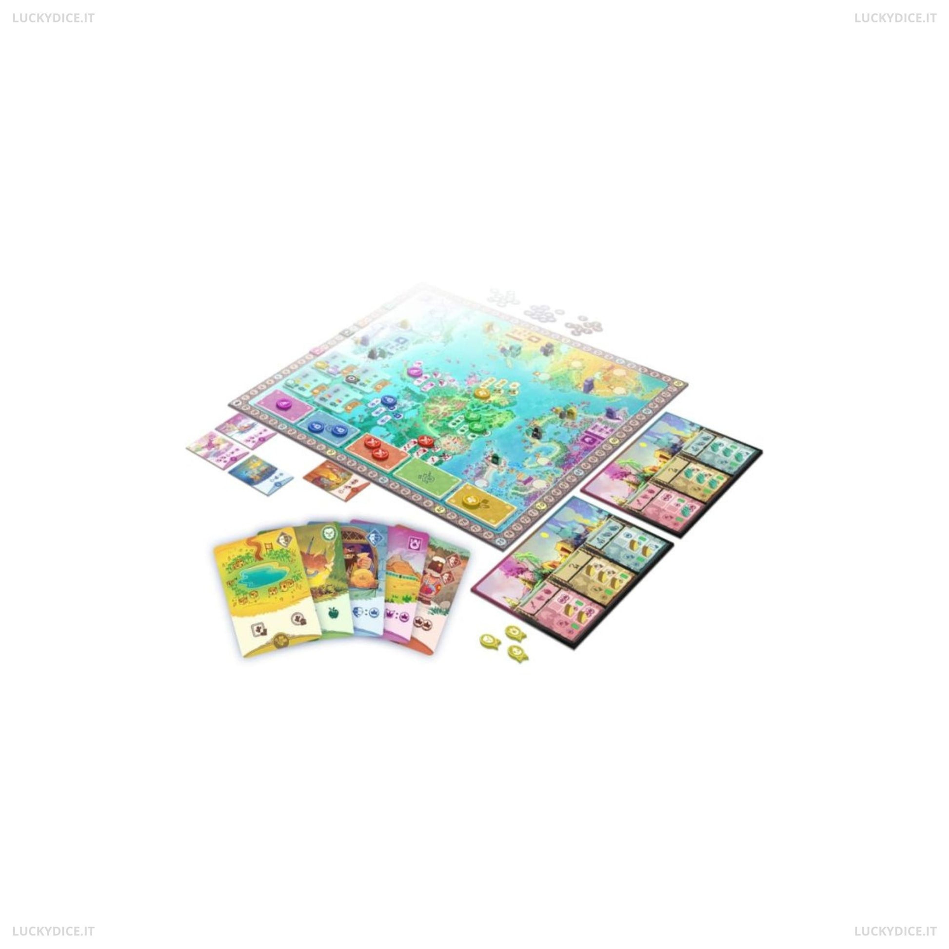 Le carte Avventura ti forniscono benefici immediati, abilità permanenti e prestigio presso le diverse razze di Navoria, sbloccando preziosi bonus di fine partita. Dopo il draft, gli stessi token vengono usati in una fase di piazzamento lavoratori, dove ogni azione si indebolisce man mano che viene scelta: agisci per primo per ottenere il massimo vantaggio!