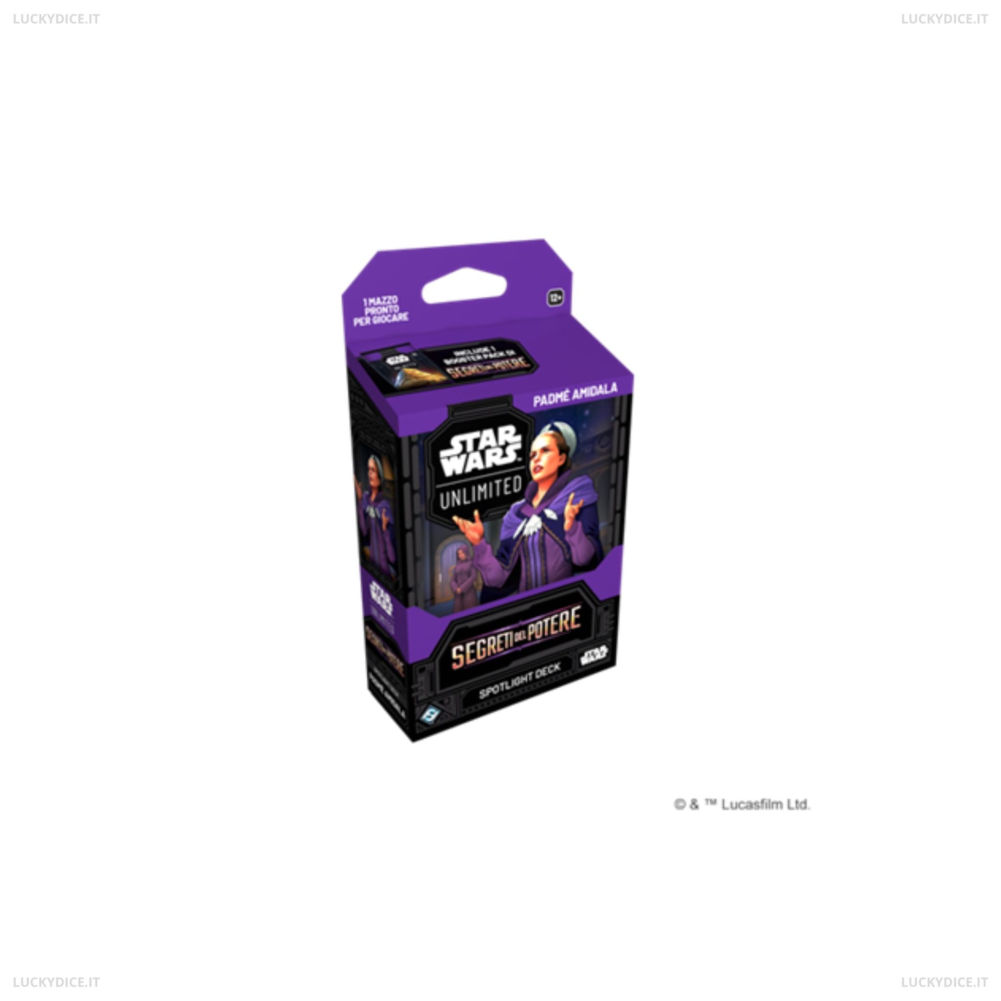 Lo Spotlight Deck: Padmé Amidala è la scelta perfetta per chi vuole iniziare a giocare a Star Wars™: Unlimited o arricchire la propria collezione con un mazzo tematico già pronto all’uso. Al suo interno troverai una carta leader dedicata a Padmé Amidala e un mazzo precostruito di 50 carte studiato per sfruttare al meglio le sue abilità, combinando carte provenienti da diversi set e includendo quattro esclusive disponibili solo in questa confezione. Oltre al mazzo, la scatola contiene una carta base, tre carte segnalino a due lati, ben 31 gettoni per gestire danni e risorse, e un booster pack dell’espansione Segreti del Potere per personalizzare e potenziare la tua strategia. Facile da imparare e immediatamente giocabile, questo Spotlight Deck offre un’esperienza completa e coinvolgente, permettendoti di affrontare fin da subito emozionanti battaglie uno contro uno nell’universo di Star Wars.